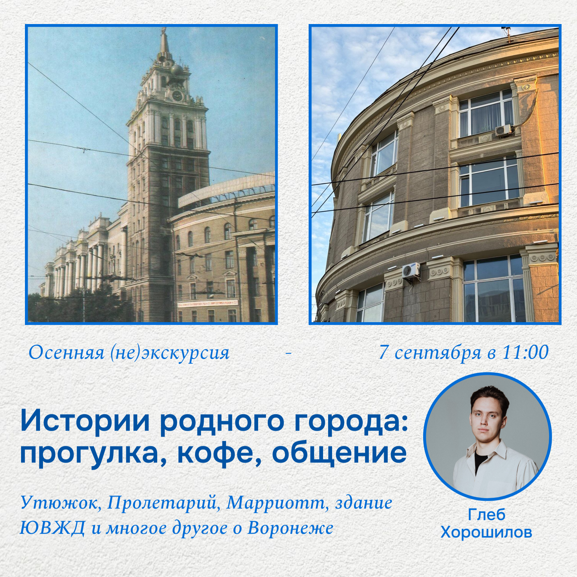 - 7 сентября в 11:00 устроим прогулку с таинственным названием: Истории родного города. Ведущий воронежский рилсмейкер и журналист, @gleb_xorosh (Глеб Хорошилов). Обещает не закапываться в детали, рассказывать интересно и с юмором. Без него никак